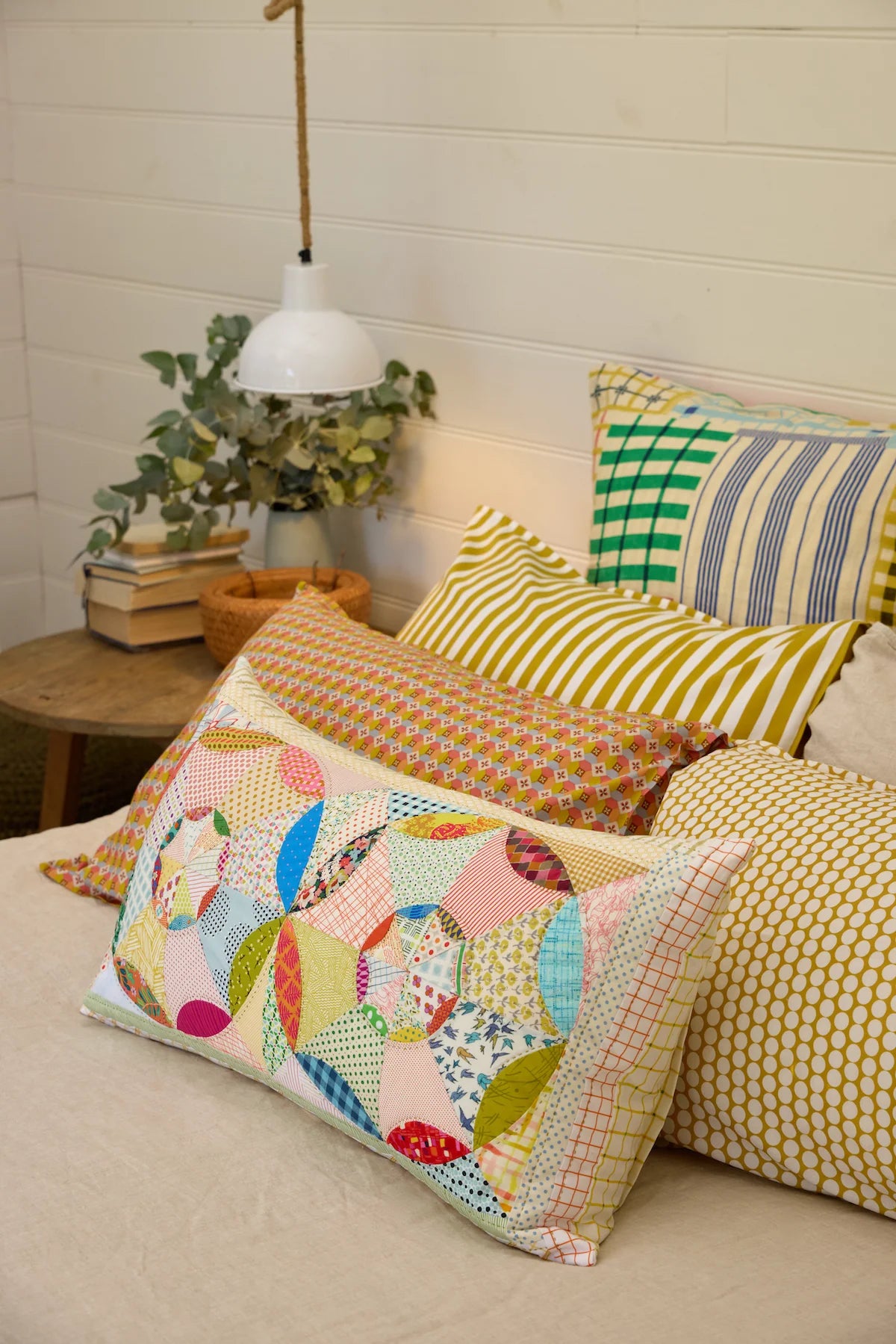 Lottie's Web is featured twice in Gathered. The quilt is made with an 8" block and the pillow is made with a 12" block.